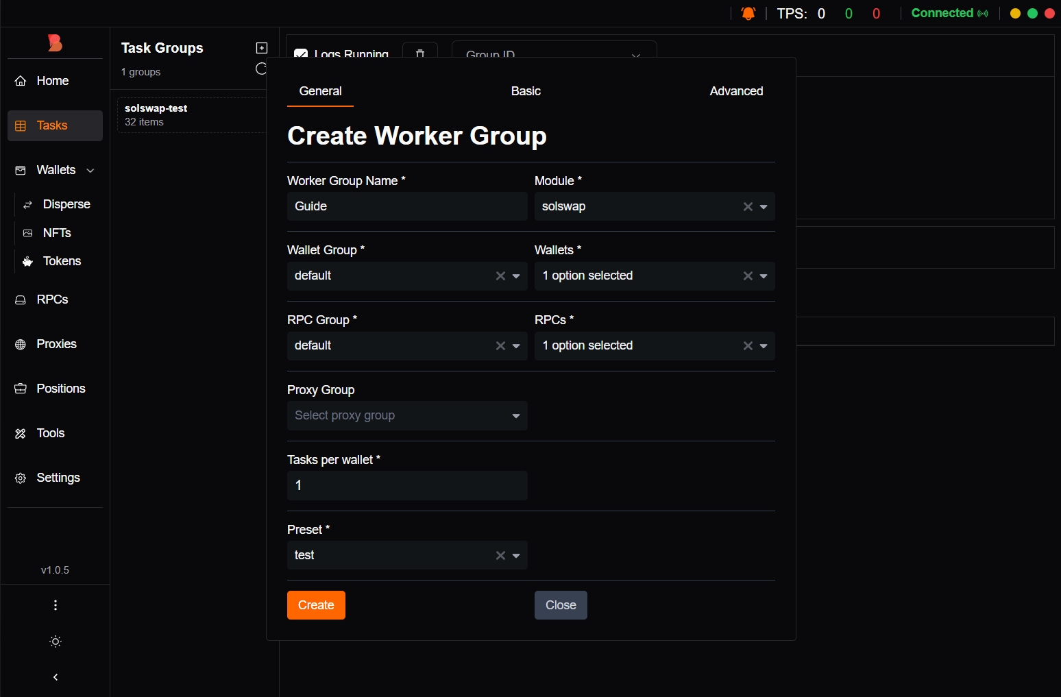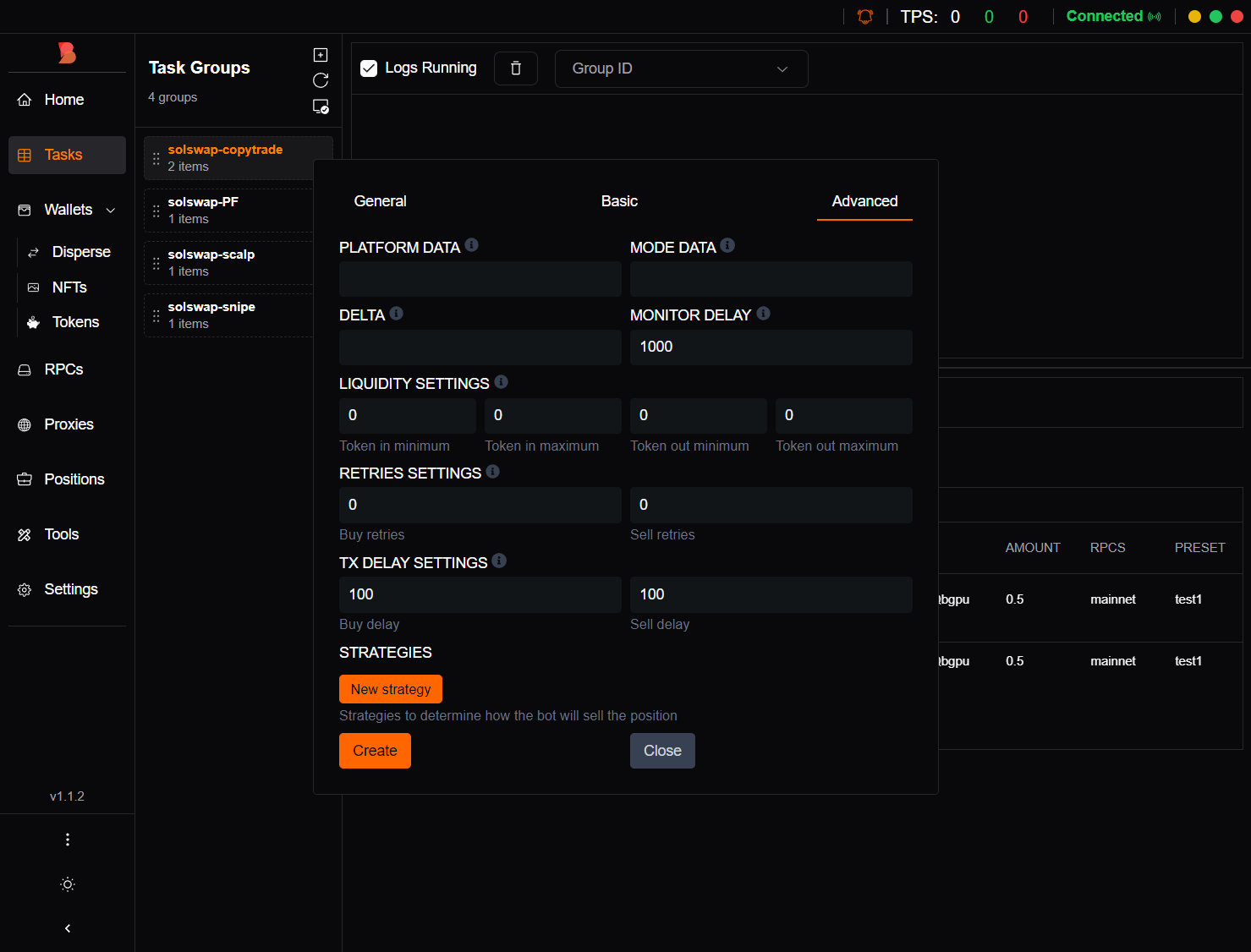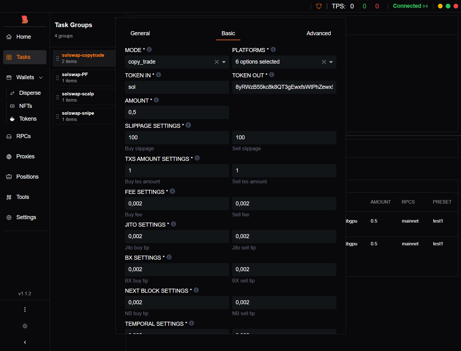 Set the slippage percentage for buying/selling - how much the price can change before the transaction is considered invalid.